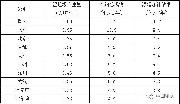 人口规模前十的垃圾分类试点城市厨余垃圾处理补贴测算